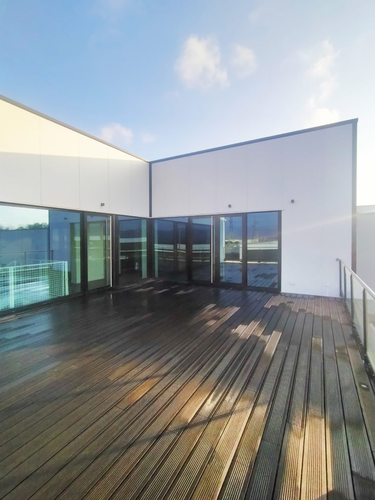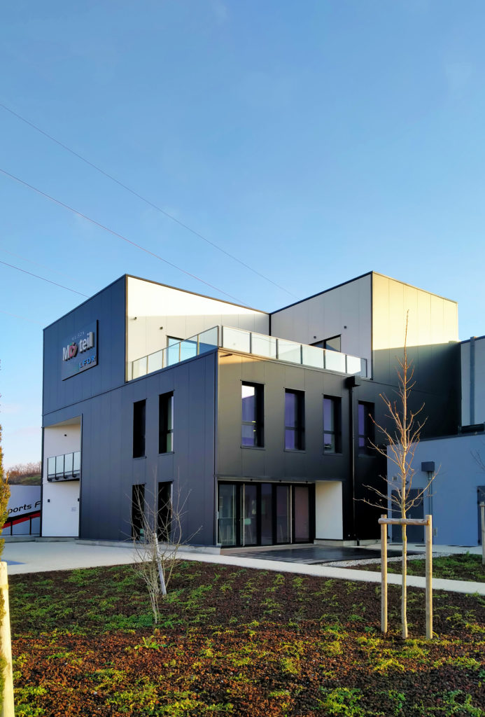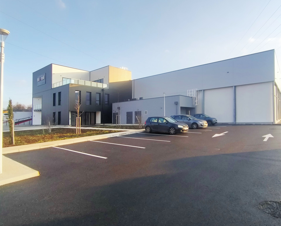 Le bâtiment est composé de 3 grandes halles et d’un volume cubique, celui des bureaux. Les points spécifique de ce volume sont creusés pour signaler les espaces spécifiques : l’entrée, la cafétéria, la terrasse de réception.